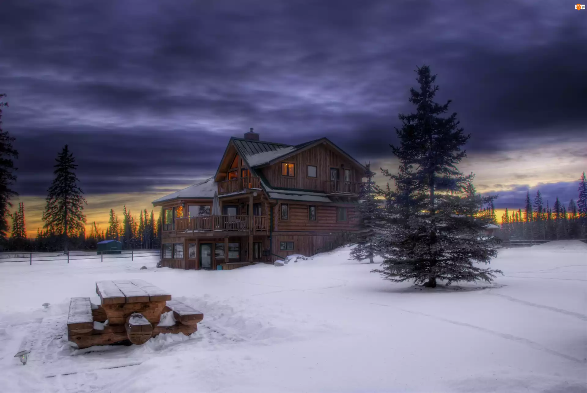 Ławeczka, Choinki, Śnieg, Chmury, Dom