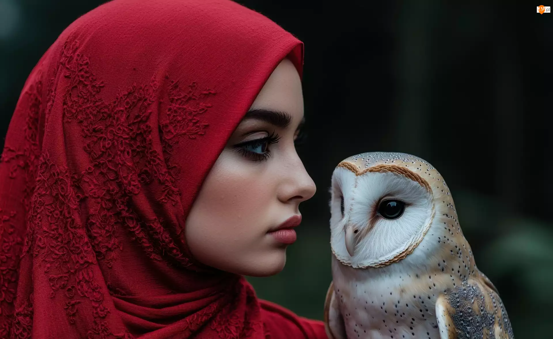 Chusta, Czerwona, Grafika, Kobieta, Płomykówka, Sowa, Profil