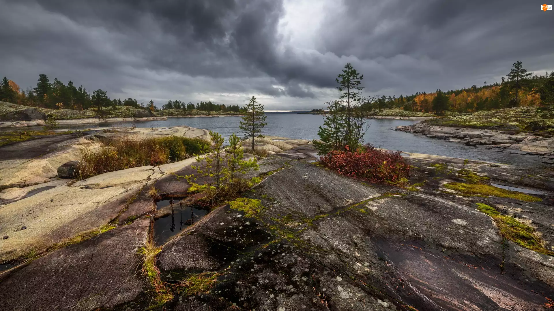 Ciemne chmury nad skałami i Jeziorem Ładoga