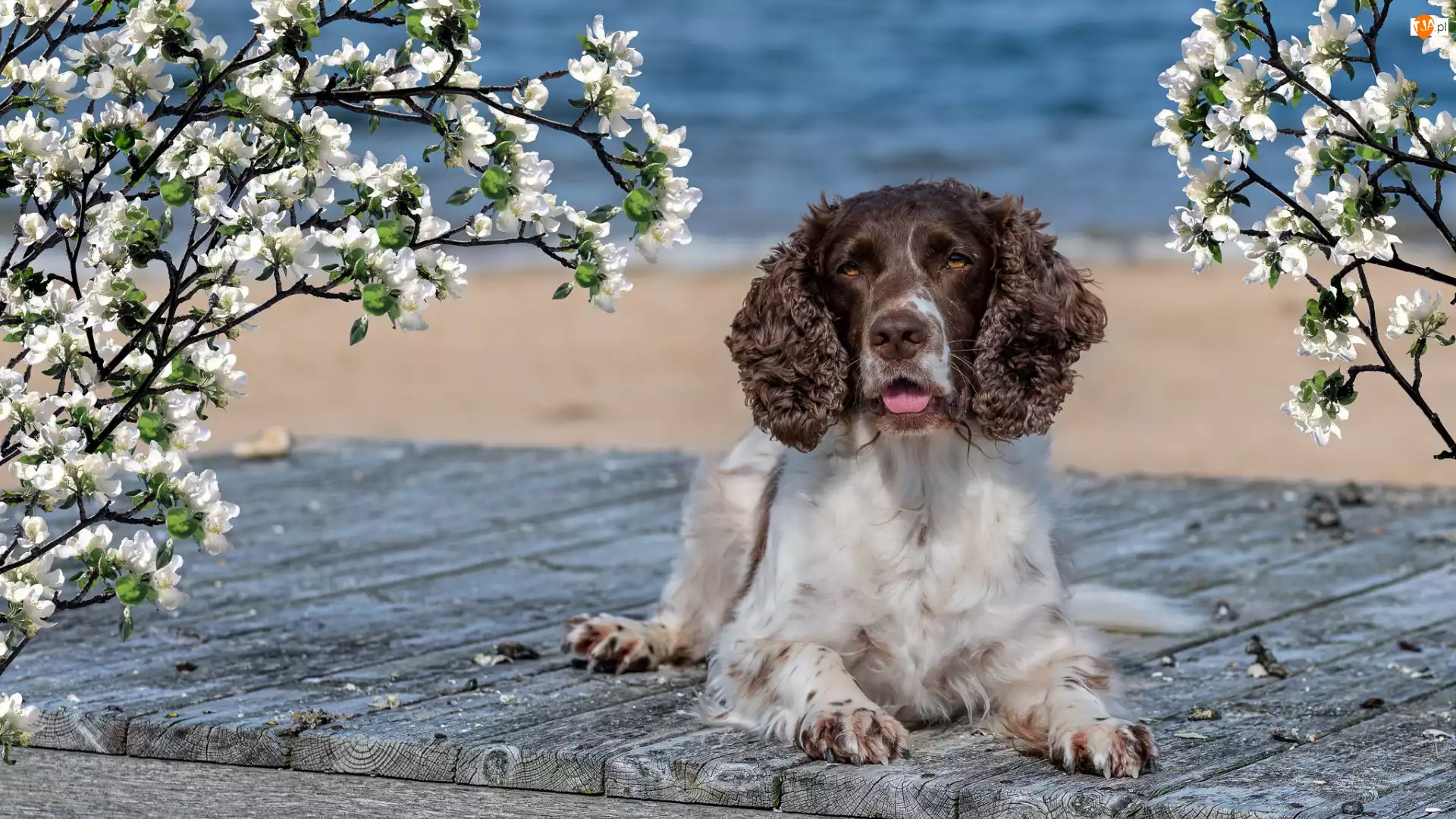 Deski, Gałązki, Springer spaniel angielski, Pies, Okwiecone