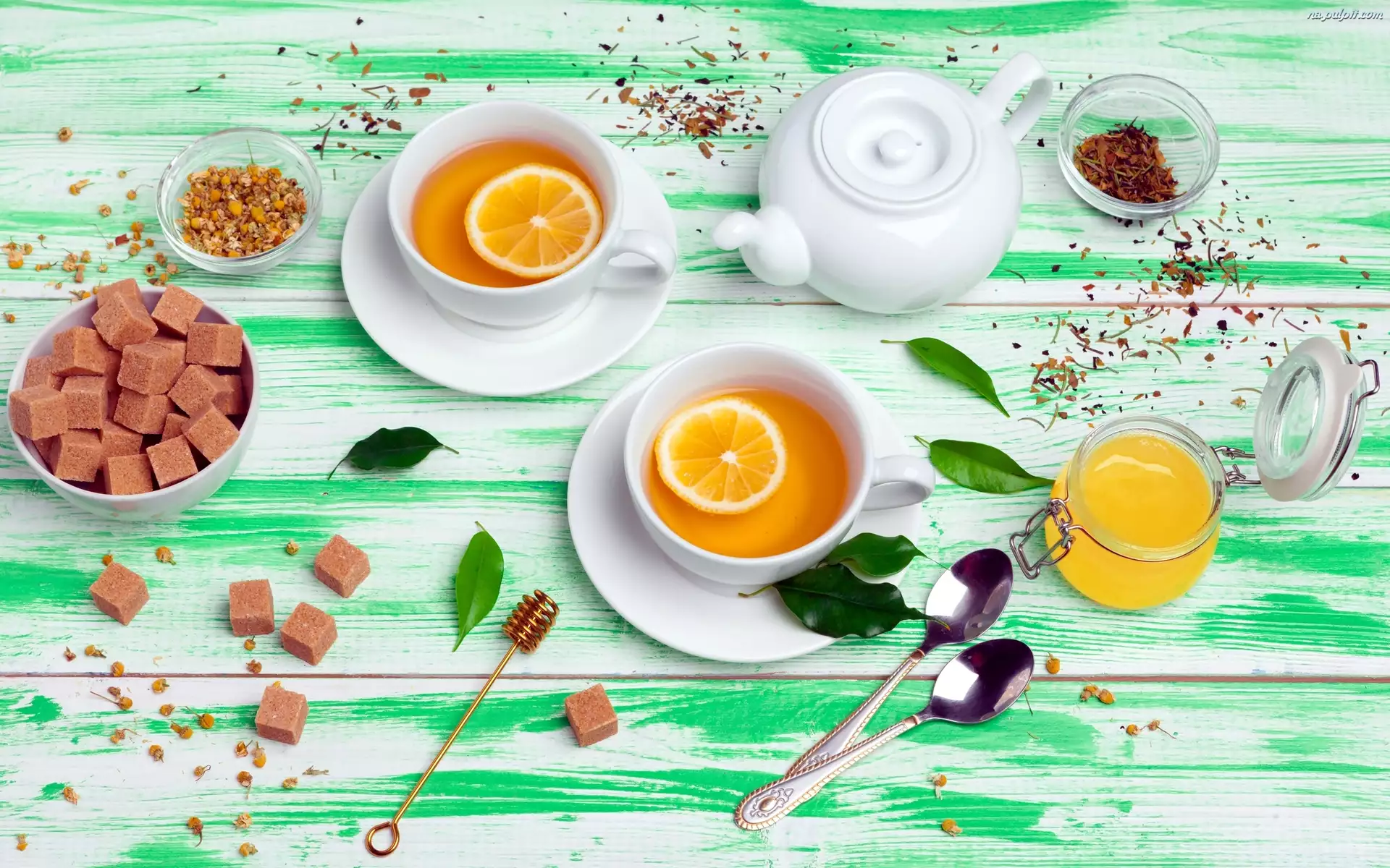 Cytryna, Cukier, Kompozycja, Herbata, Dzbanek, Filiżanki, Miód