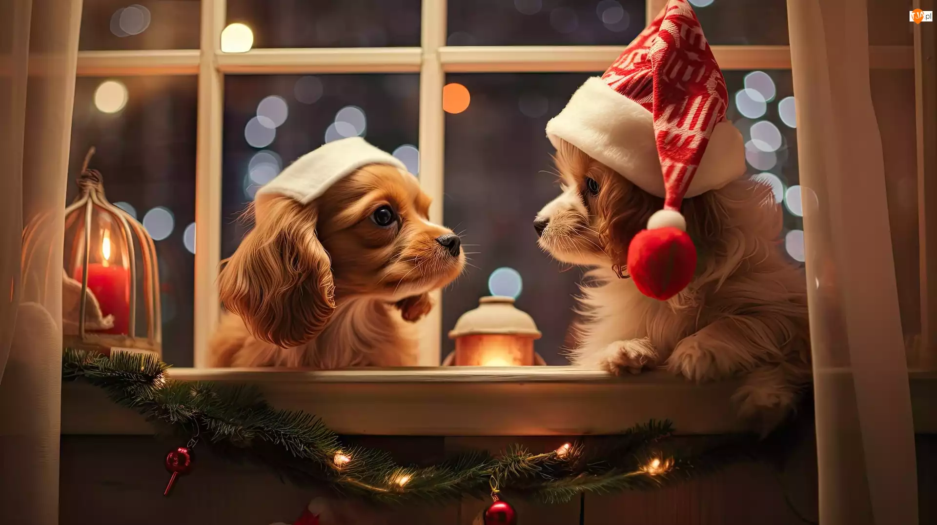 Czapki, Świeca, Szczeniaki, Psy, Okno