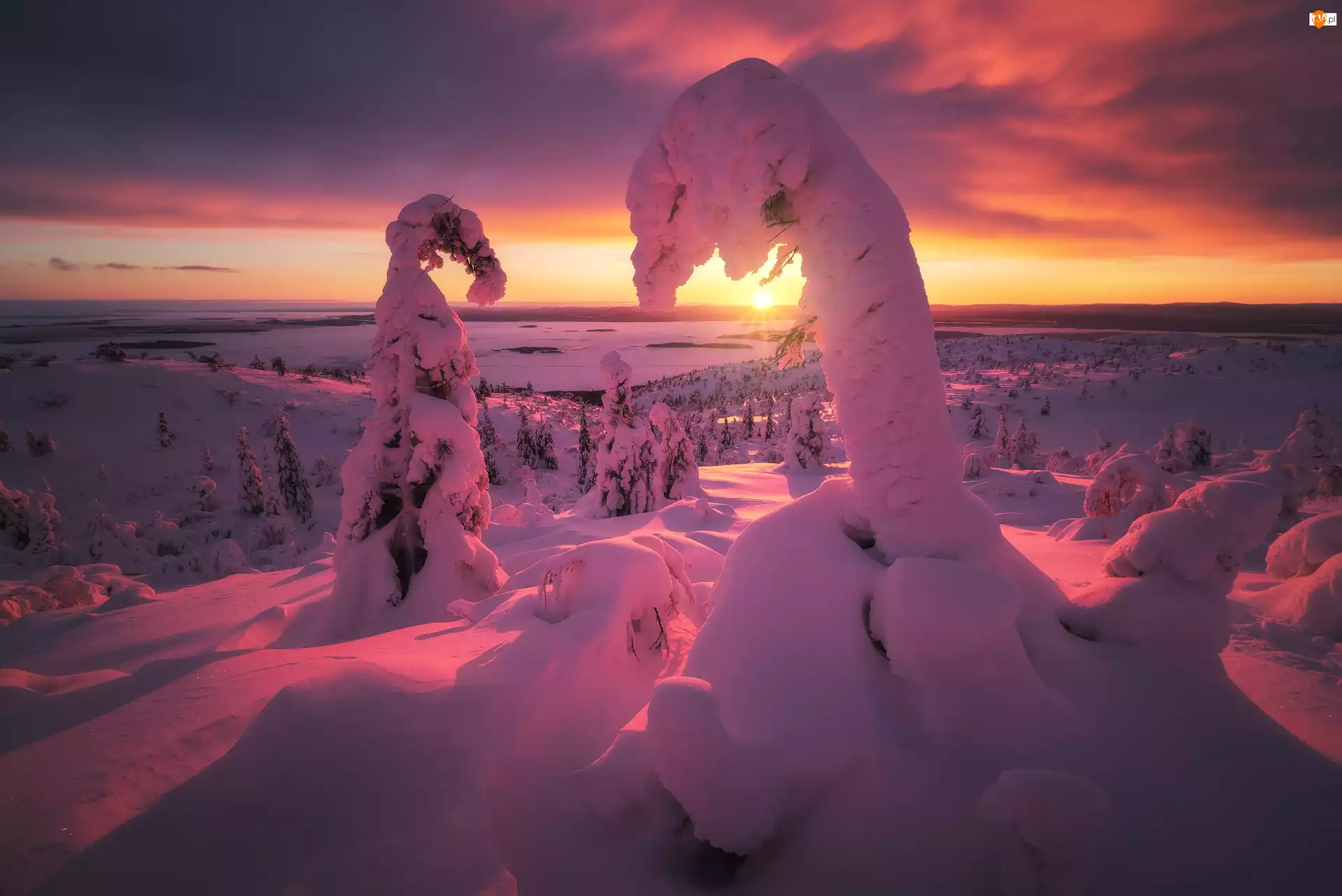 Drzewa, Zima, Zatoka Kandałaksza, Rosja, Zachód słońca, Półwysep Kolski