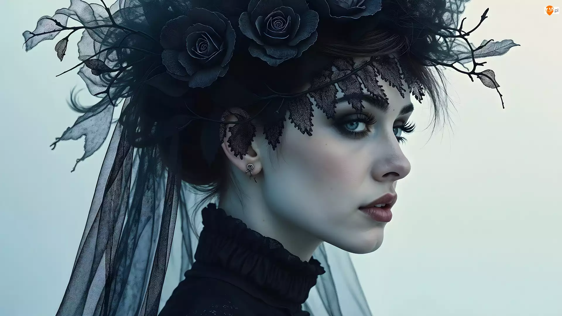 Czarny, AI, Półprofil, Kobieta, Welon