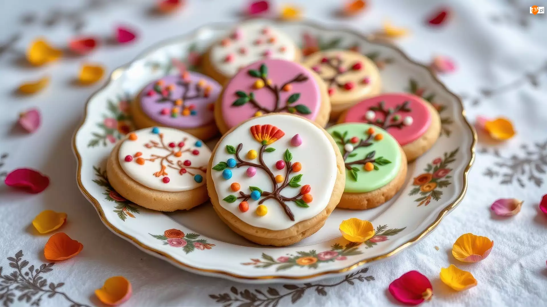 Czerwone, Kolorowe, Talerz, Płatki, Lukrowane, Żółte, Kwiatów, Ciastka