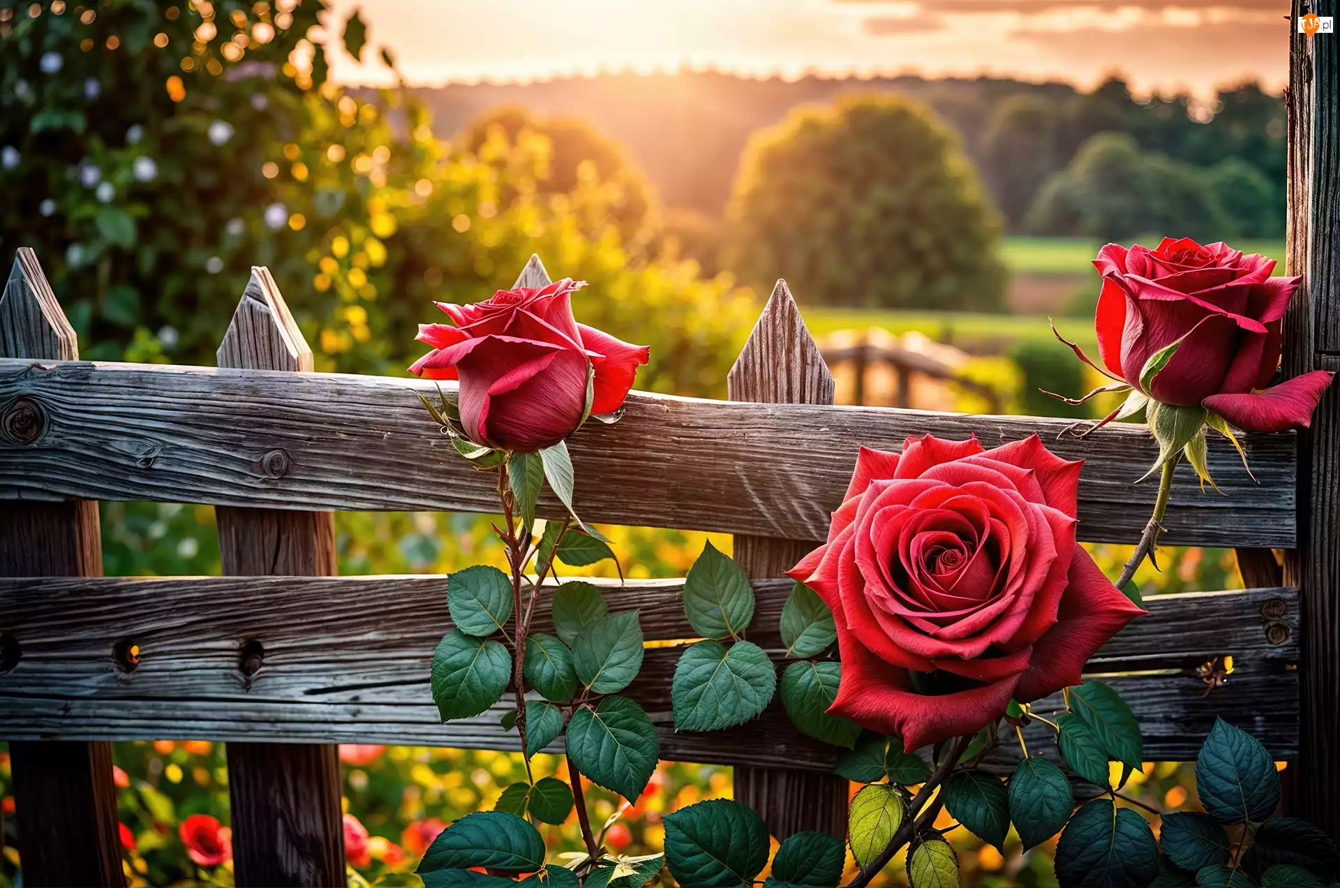 Czerwone, Róże, Płot, Grafika, Kwiaty, Zachód słońca