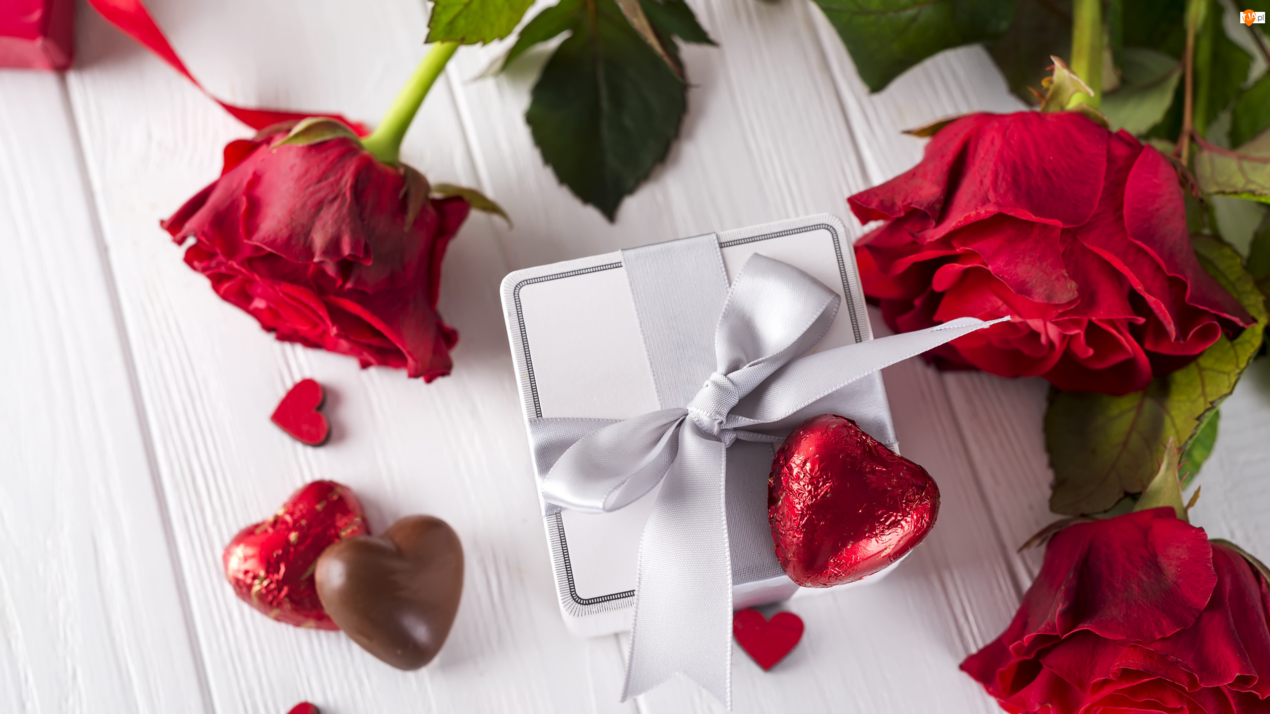Serduszka, Walentynki, Prezent, Róże, Czekoladki