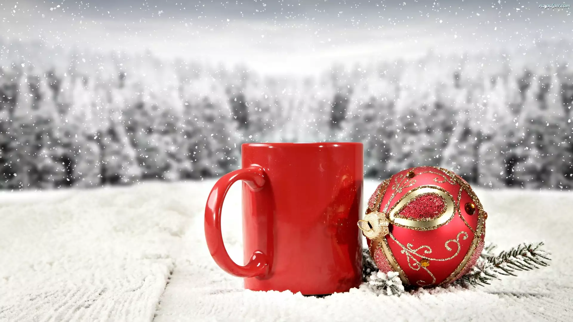 Czerwony kubek z bombką w śniegu