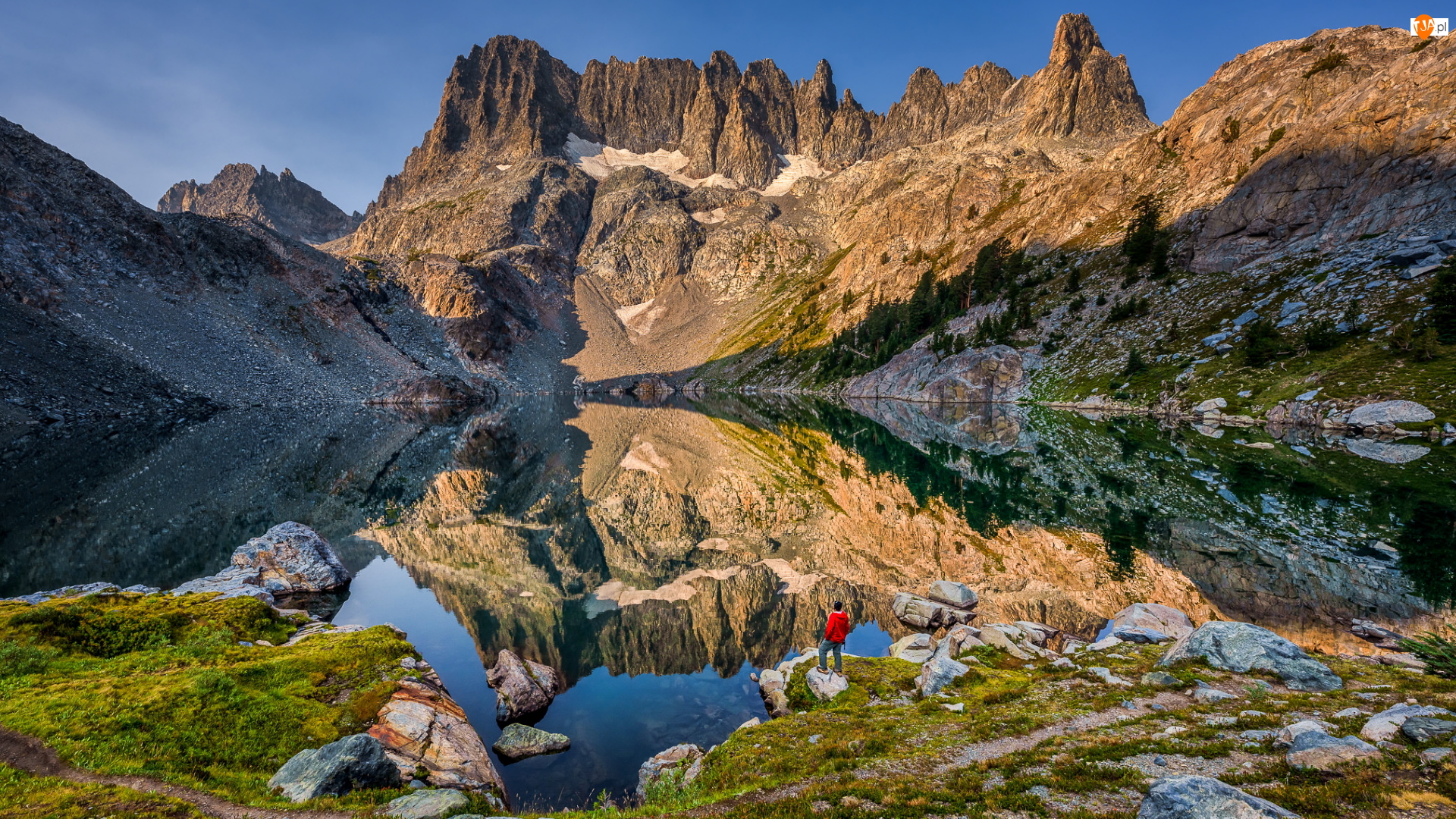 Stany Zjednoczone, Sierra Nevada, Kalifornia, Jezioro, Lake Iceberg, Odbicie, Skały, Góry, Człowiek