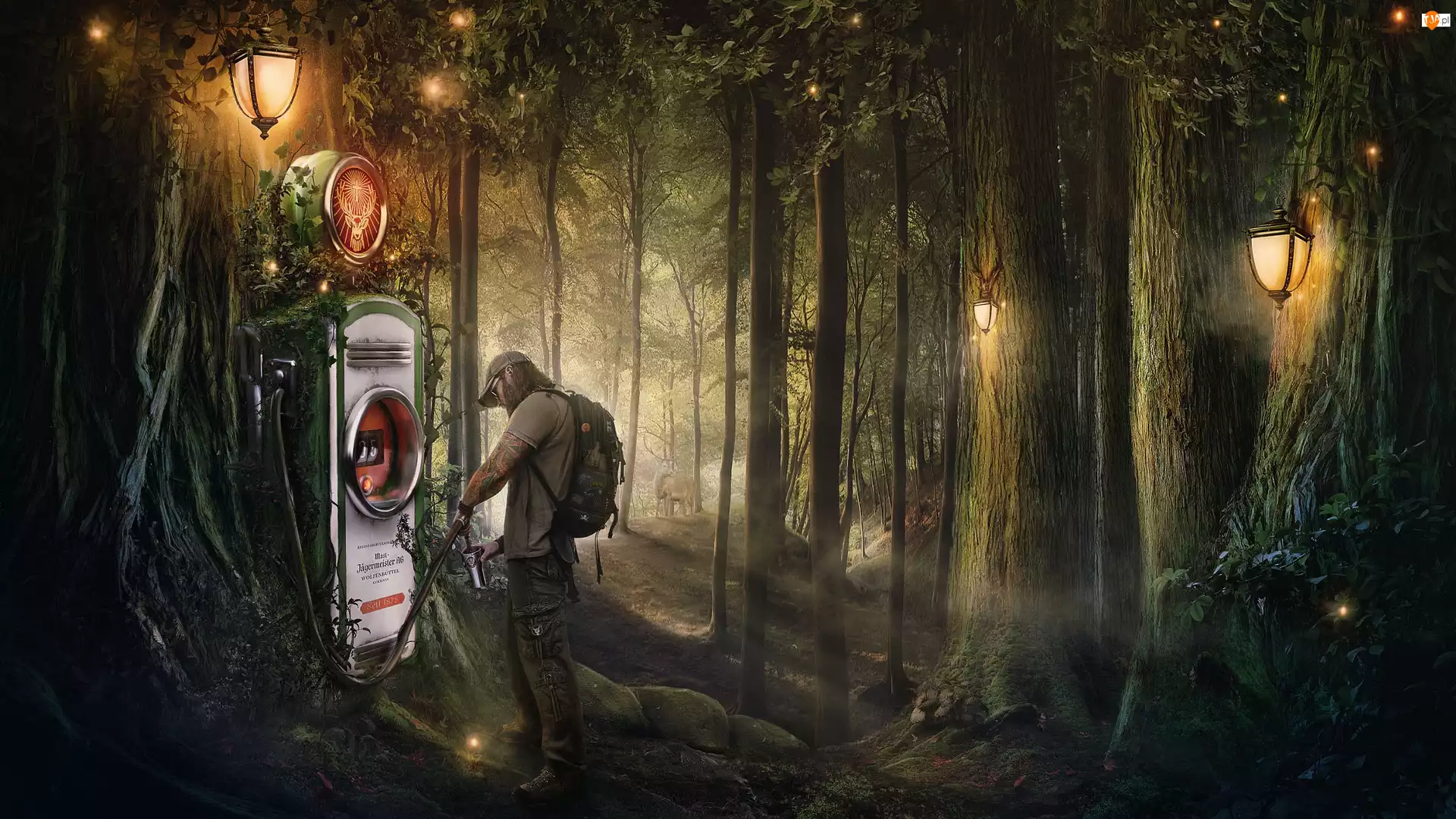 Dystrybutor, Las, Lampiony, Drzewa, Człowiek