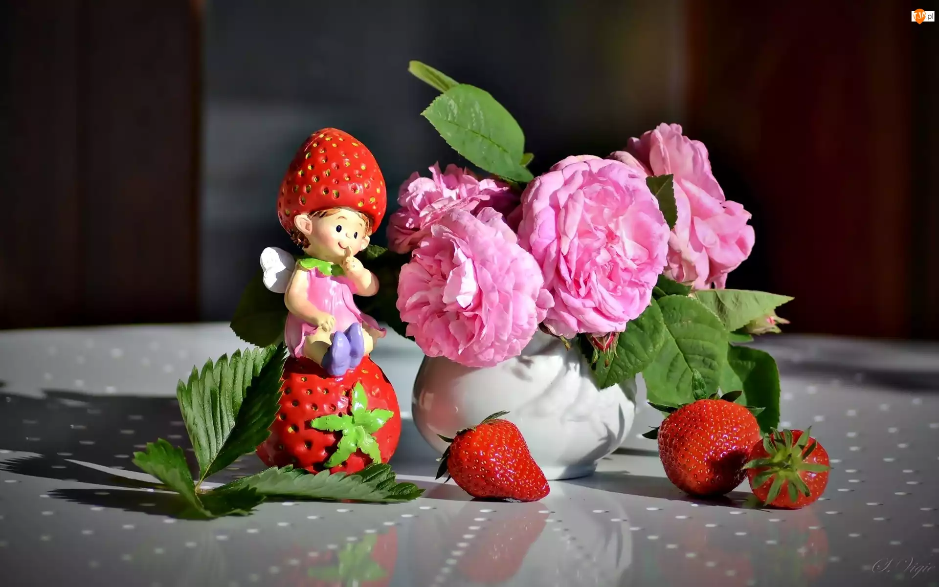 Dekoracja, Truskawki, Różowe, Figurka, Róże