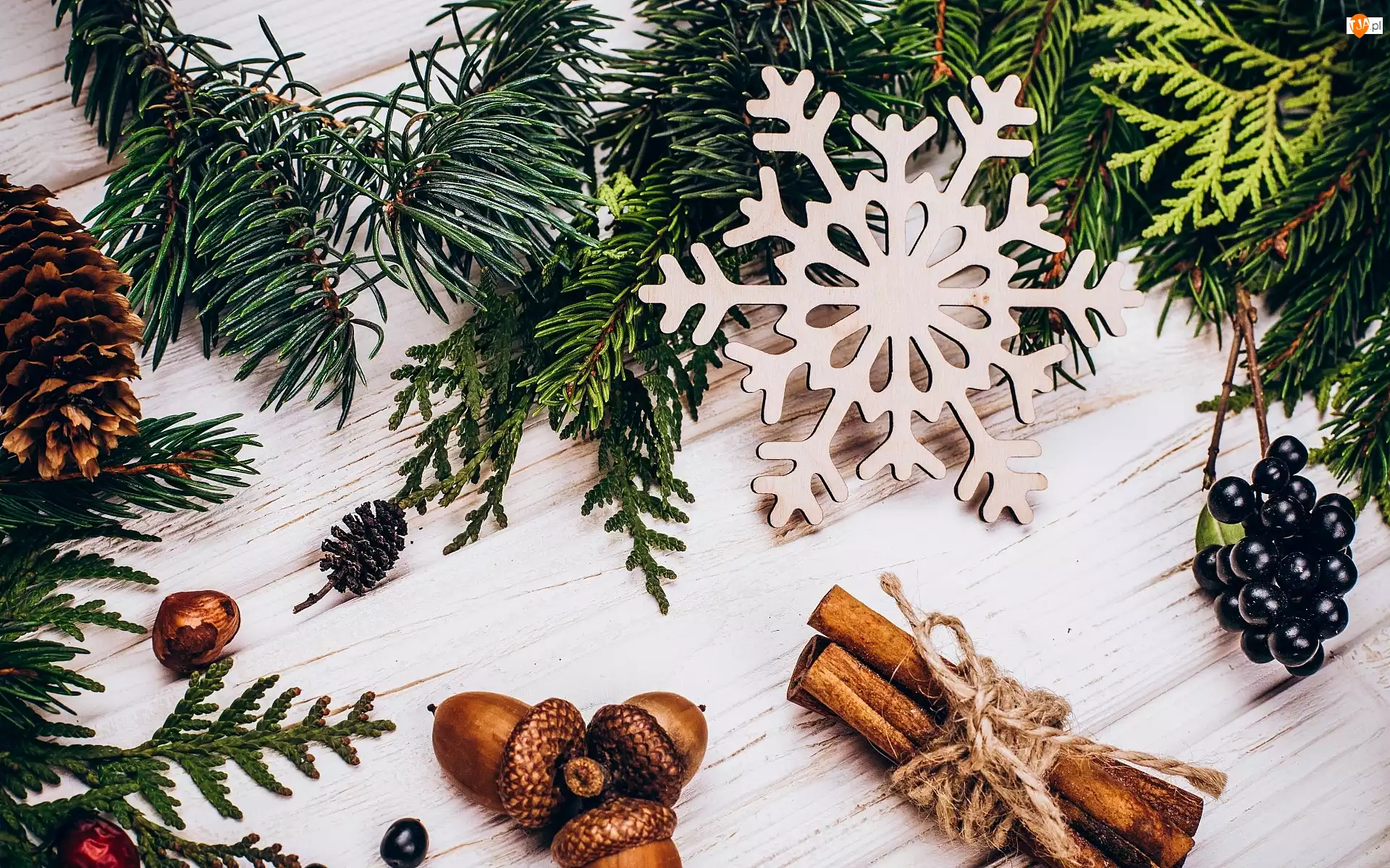 Kompozycja, Gałązki, Śnieżynka, Świąteczna, Szyszki, Cynamon, Żołędzie