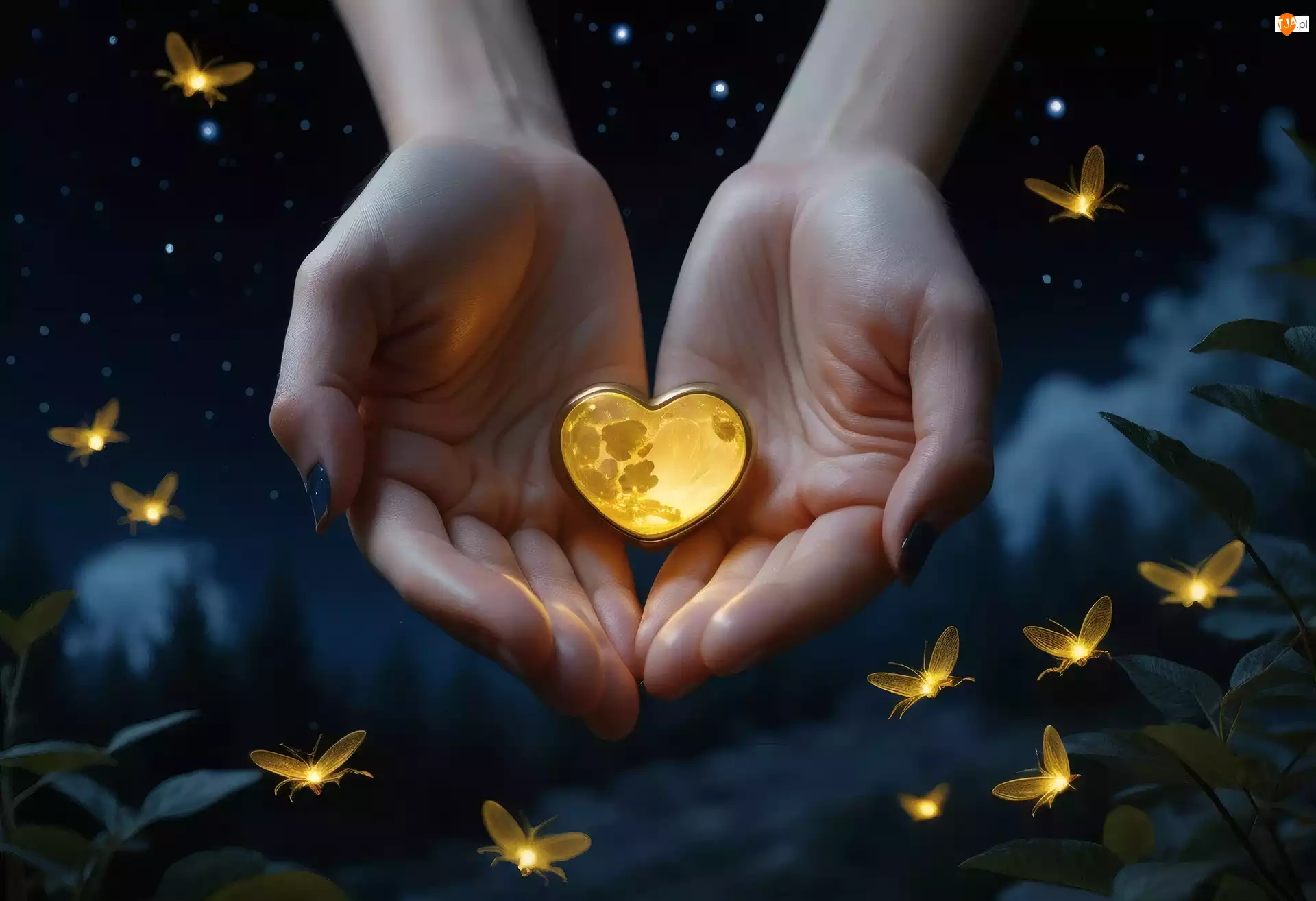 Światełka, Dłonie, Miłość, Gwiazdki, Motylki, Uczucie, Blask, Serce