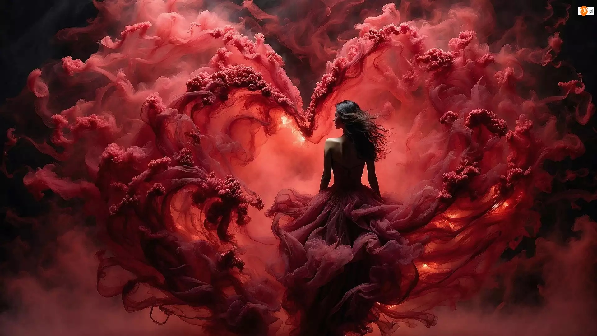 Długowłosa, Kobieta, Dym, Grafika, Czerwony, Serce, Płonące