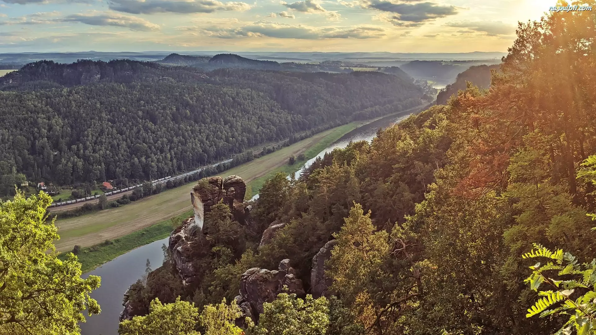 Dolina, Drzewa, Niemcy, Rzeka Łaba, Park Narodowy Saskiej Szwajcarii, Góry Połabskie, Skały
