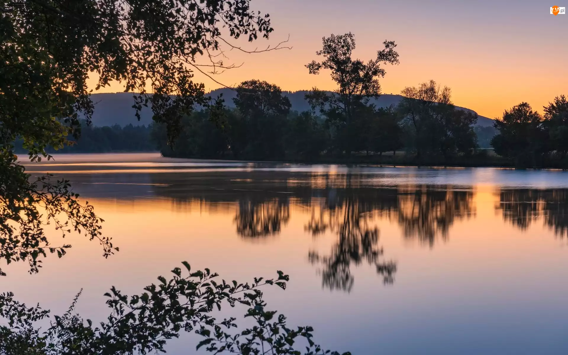 Drzewa, Niemcy, Rzeka Mozela, Wschód słońca, Odbicie