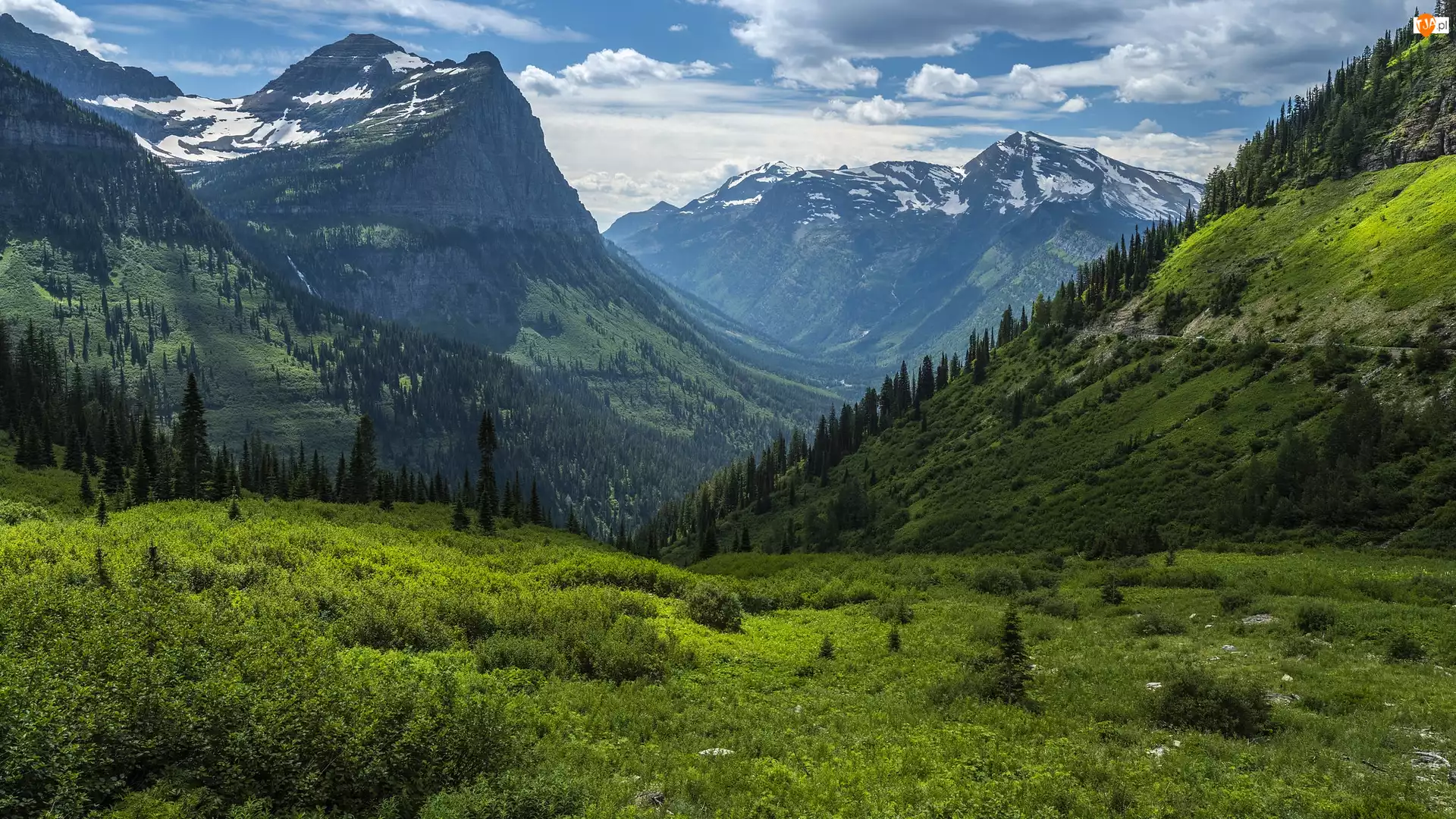 Park Narodowy Glacier, Góry Skaliste, Dolina, Stan Montana, Las, Chmury, Stany Zjednoczone, Drzewa