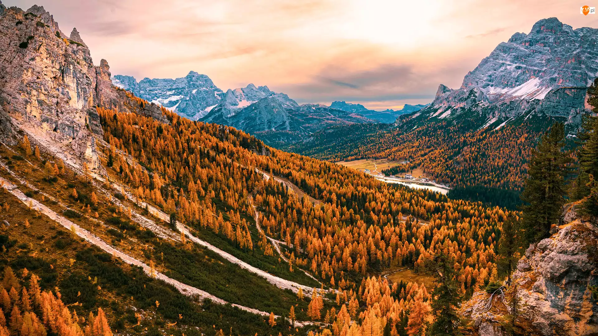 Dolomity, Góry, Drzewa, Włochy, Cadini di Misurina, Dolina