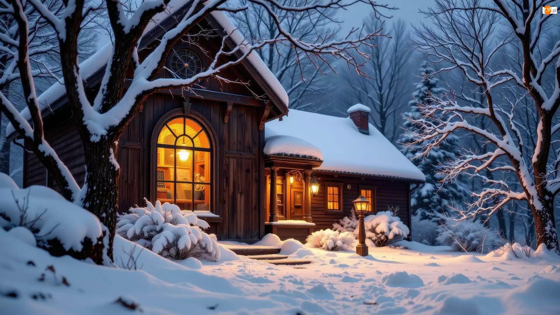 Dom, Drzewa, Oświetlony, Zima, Ośnieżone