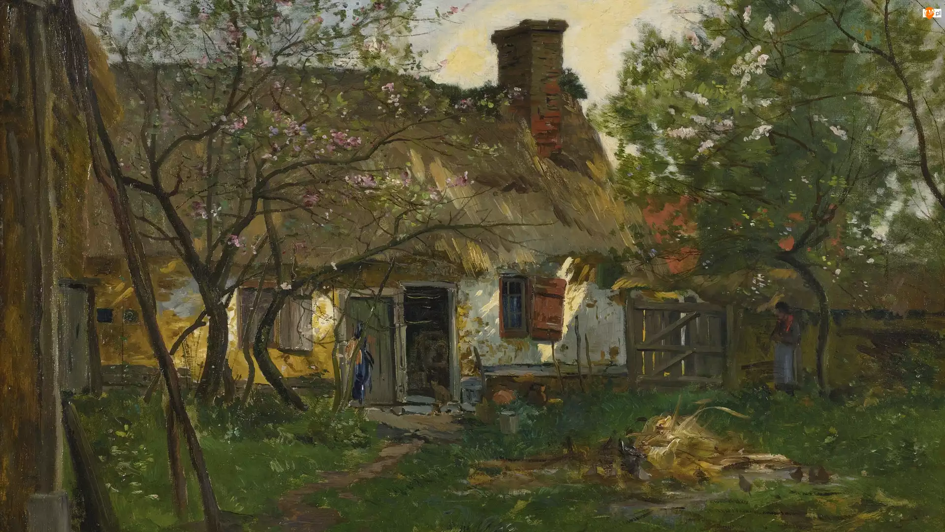 Dom, Malarstwo, Wiejska, Drzewa, Obraz, Chata, Kobieta, Hippolyte Camille Delpy