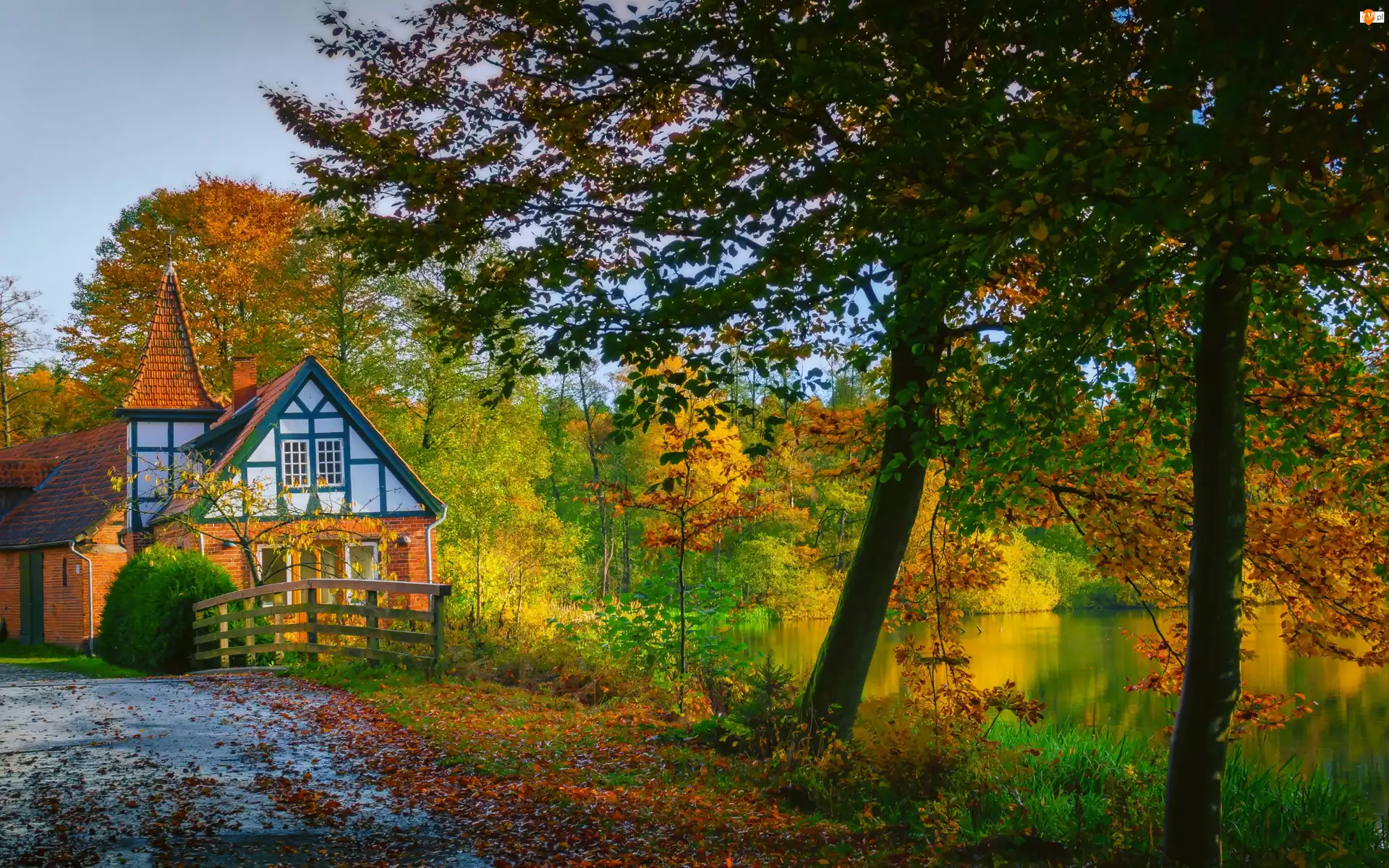 Jesień, Jezioro, Drzewa, Dom