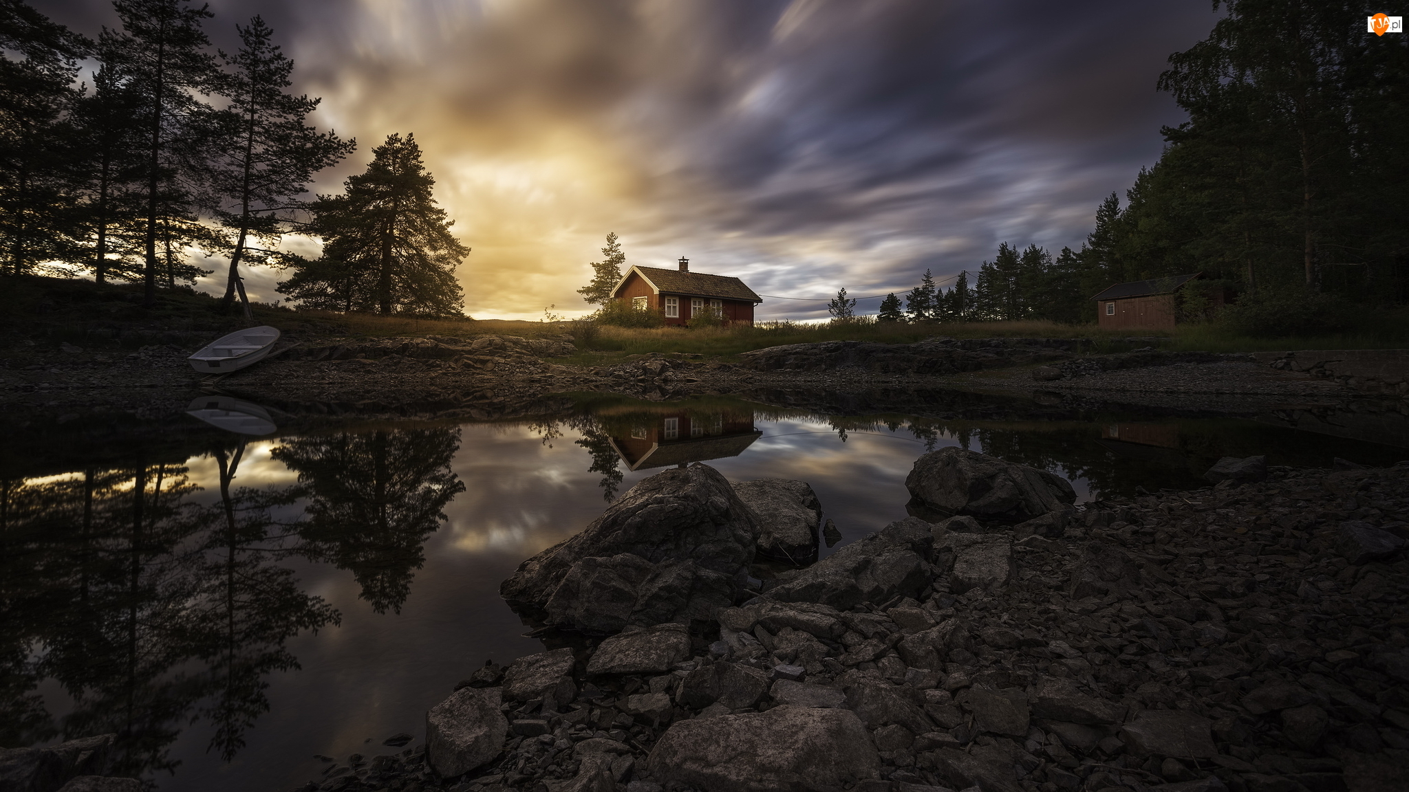 Kamienie, Dom, Ringerike, Drzewa, Norwegia, Zmierzch, Jezioro Vaeleren, Łódka
