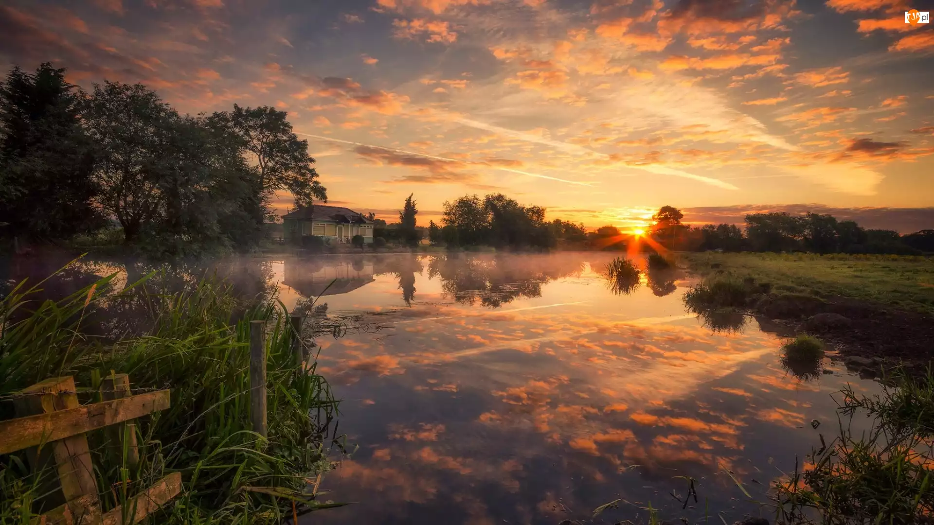 Wieś Zouch, Wschód słońca, Drzewa, Nottinghamshire, Rzeka, Dom, Anglia, River Soar