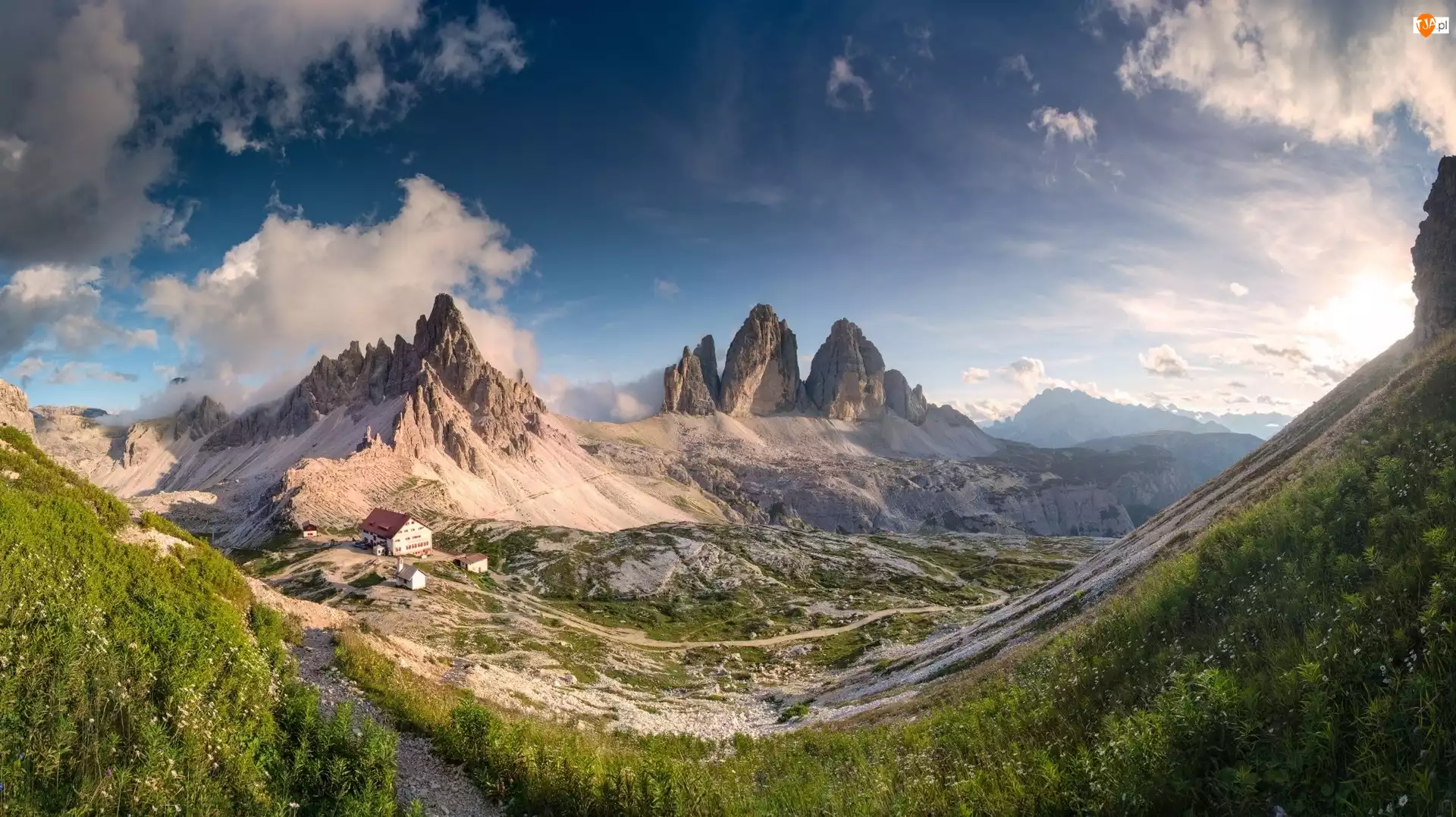 Roślinność, Dom, Chmury, Schronisko Dreizinnenhütte, Południowy Tyrol, Włochy, Góry Paterno, Dolomity, Szczyt Tre Cime di Lavaredo, Wschód słońca