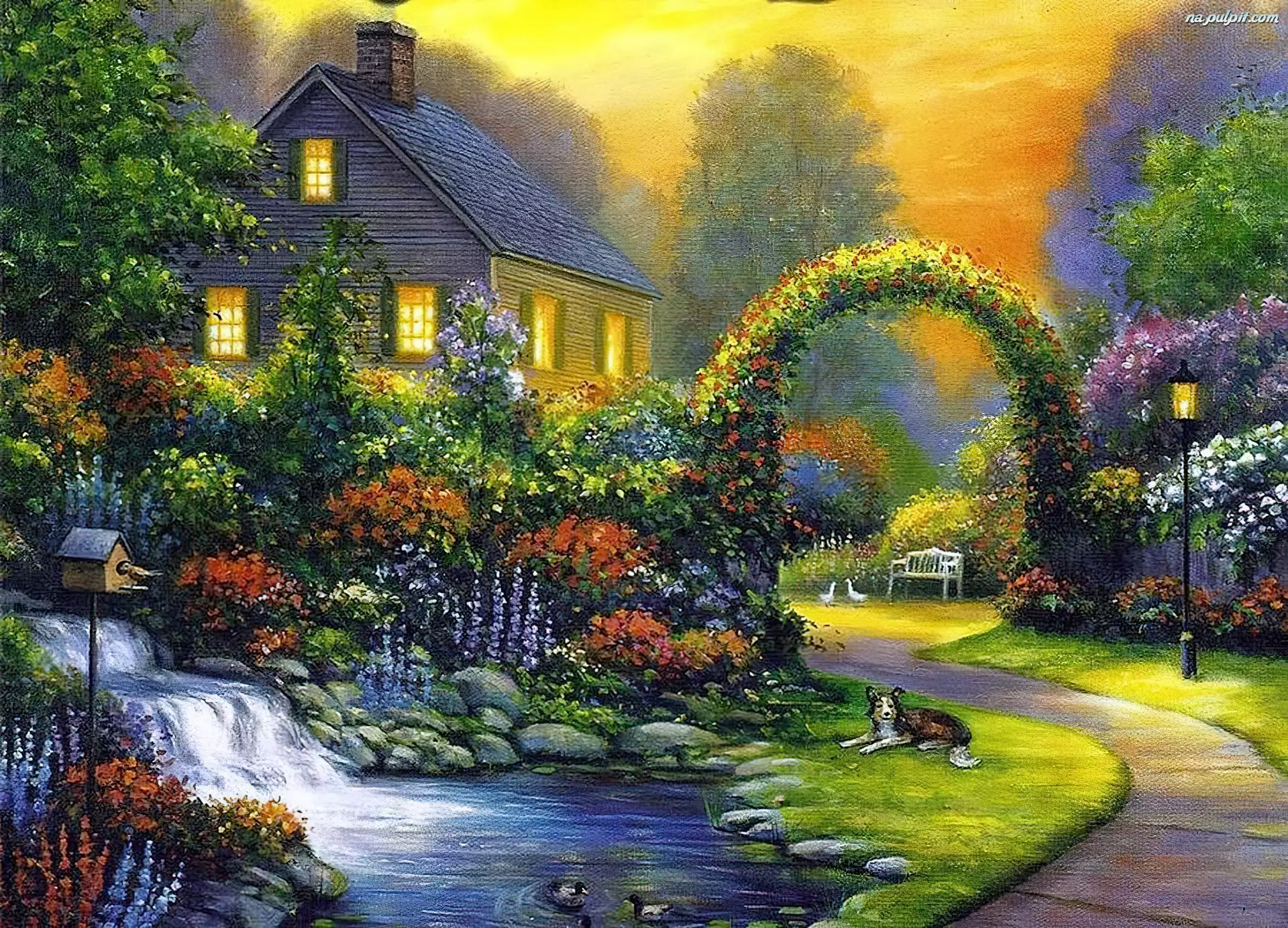 Domek, Pies, Ogród, Rzeczka