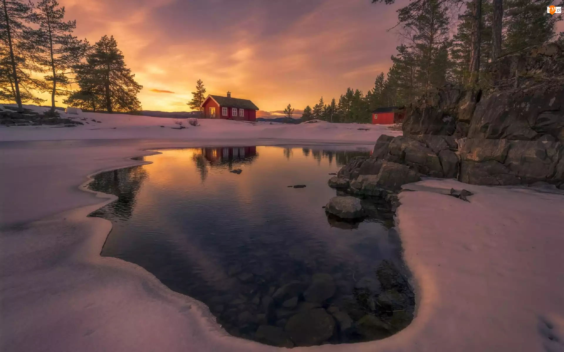 Zamarznięte, Zima, Domki, Kamienie, Jezioro, Drzewa