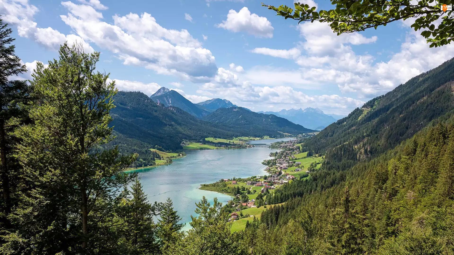 Domy, Austria, Jezioro Weissensee, Góry, Drzewa