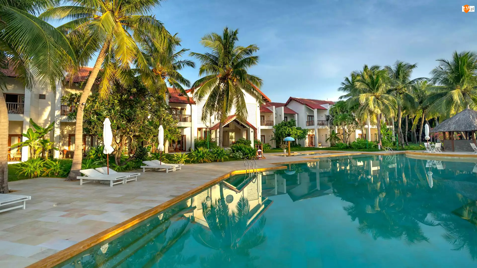 Domy, Basen, Leżaki, Palmy