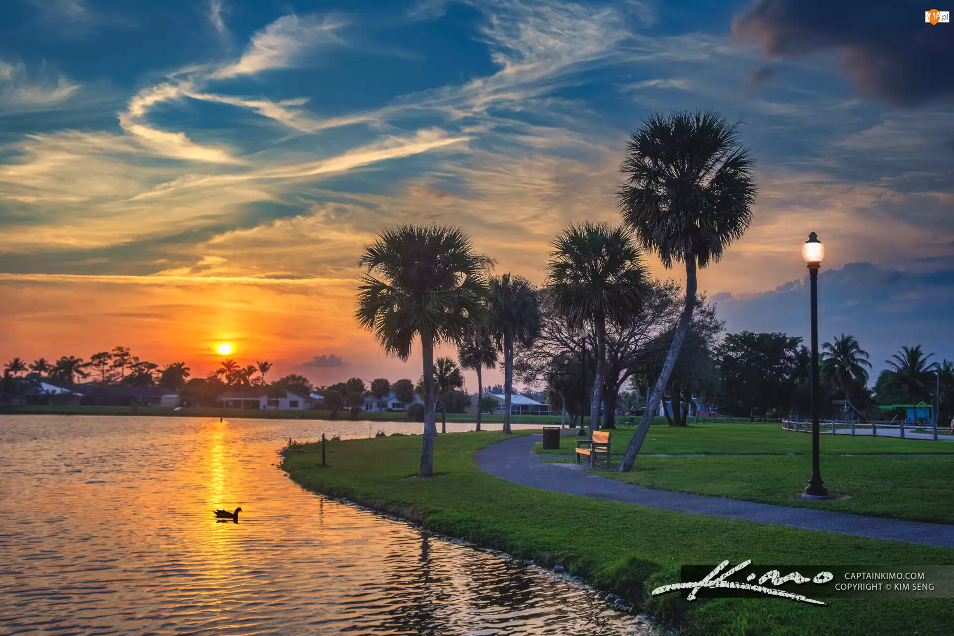 Domy, Floryda, Latarnia, Zachód słońca, Palmy, Park Challenger Lakeside, Royal Palm Beach, Stany Zjednoczone, Jezioro