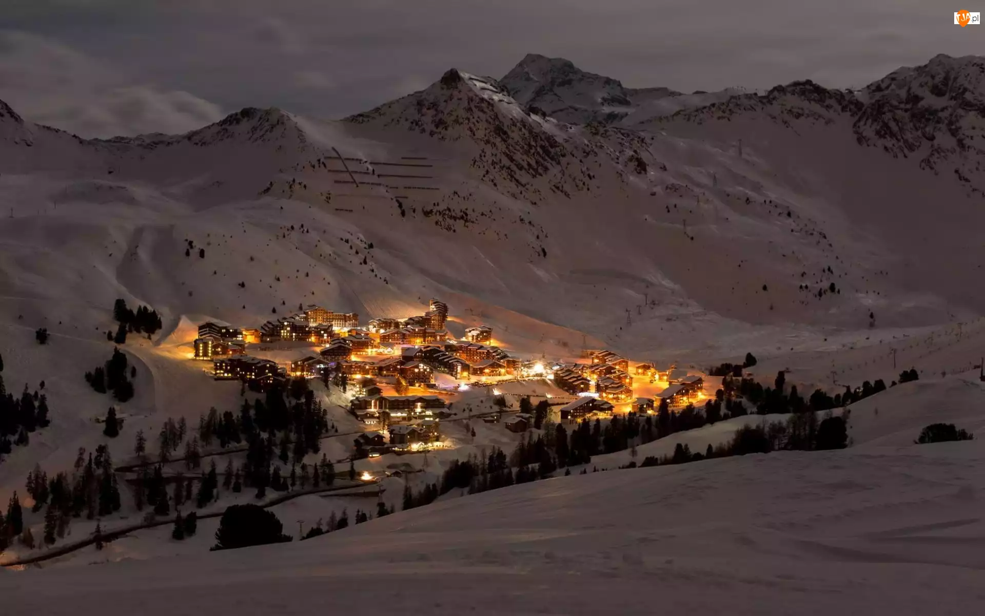 Domy, Góry, Oświetlone, Zima, Miasteczko, Drzewa