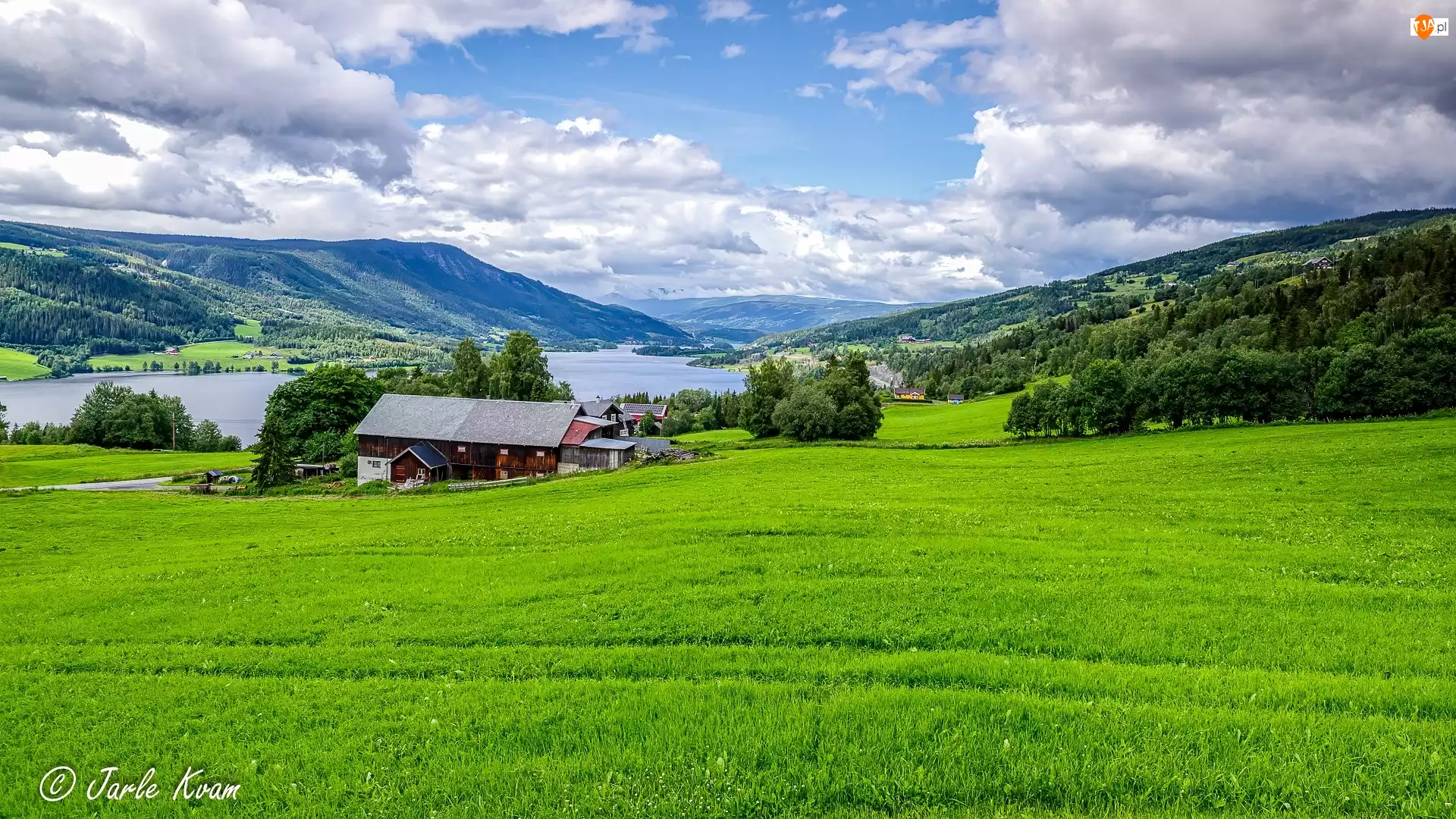 Góry, Jezioro, Łąka, Wzgórza, Dom, Pole, Drzewa