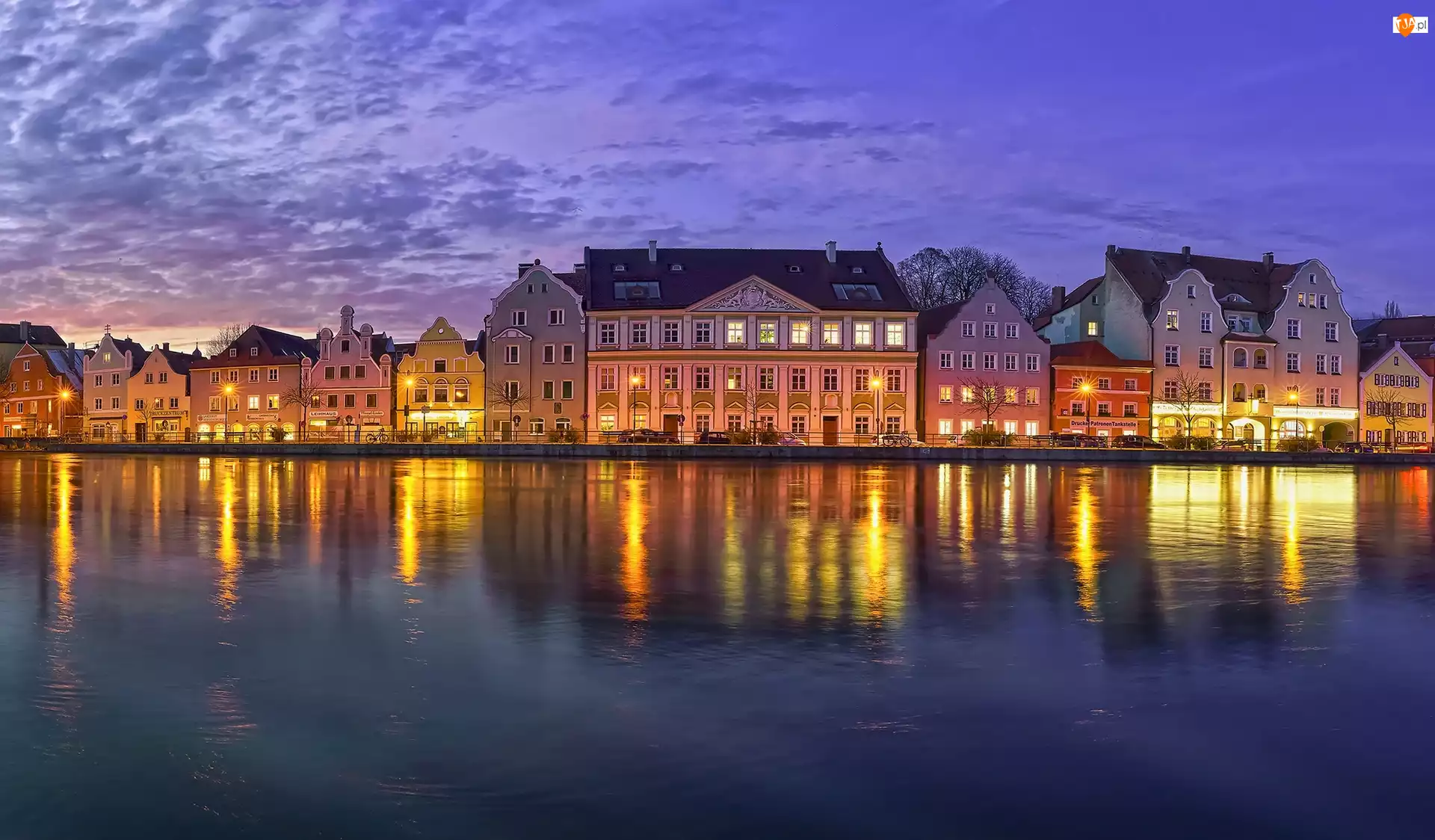 Domy, Rzeka Izara, Bawaria, Niemcy, Wieczór, Miasto Landshut, Oświetlone