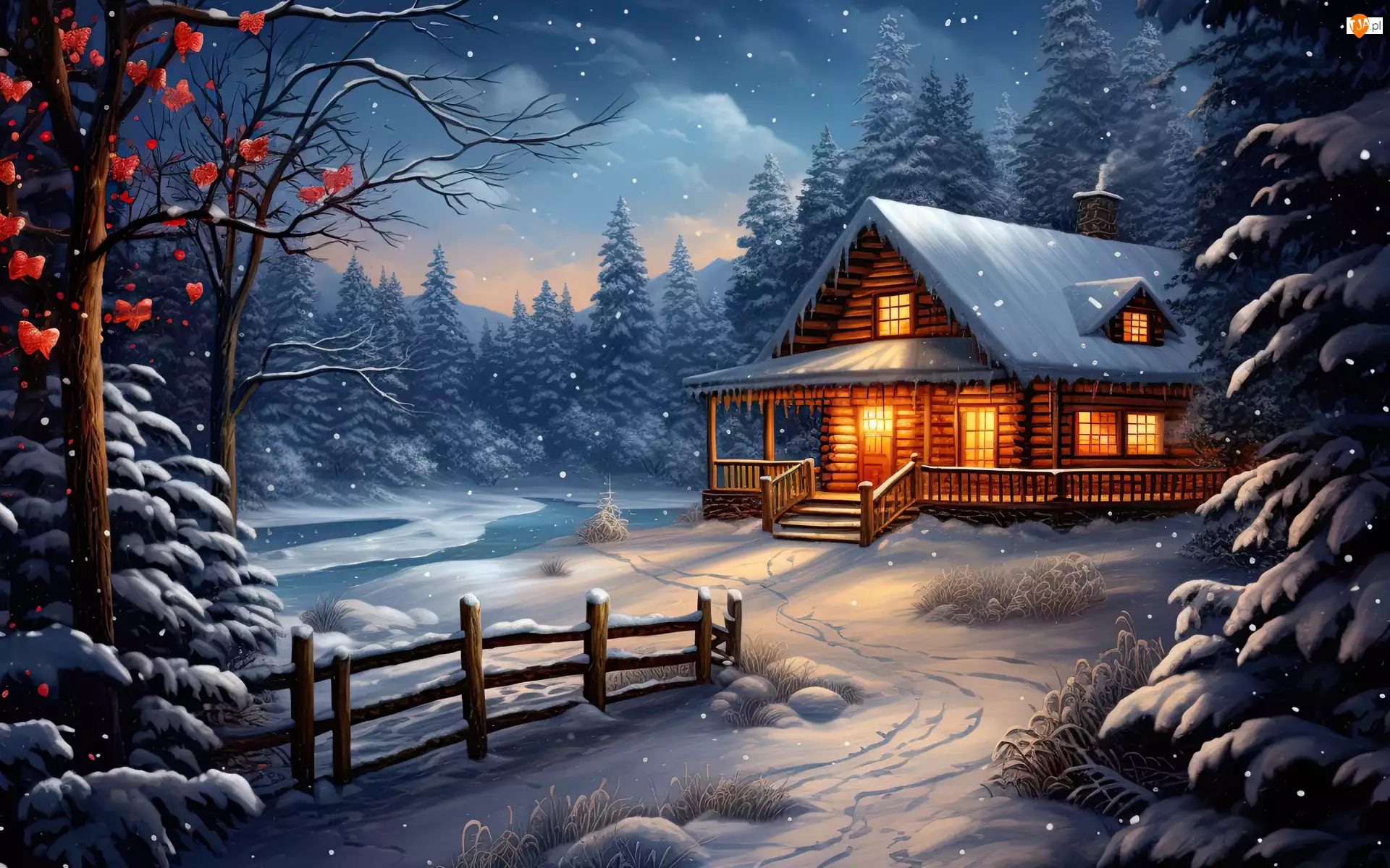 Śnieg, Zima, Dom, Światła, Las, Ogrodzenie, 2D, Drzewa