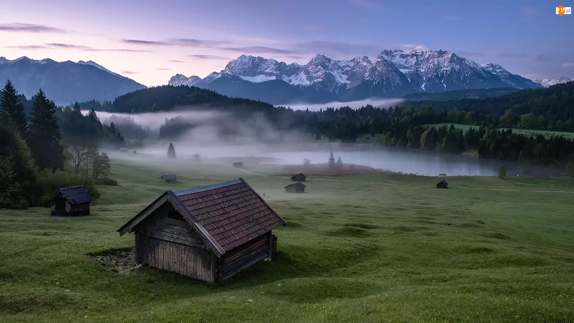 Miejscowość Krun, Las, Domek, Drzewa, Bawaria, Chmury, Jezioro Geroldsee, Niemcy, Drewniany, Góry Karwendel, Mgła