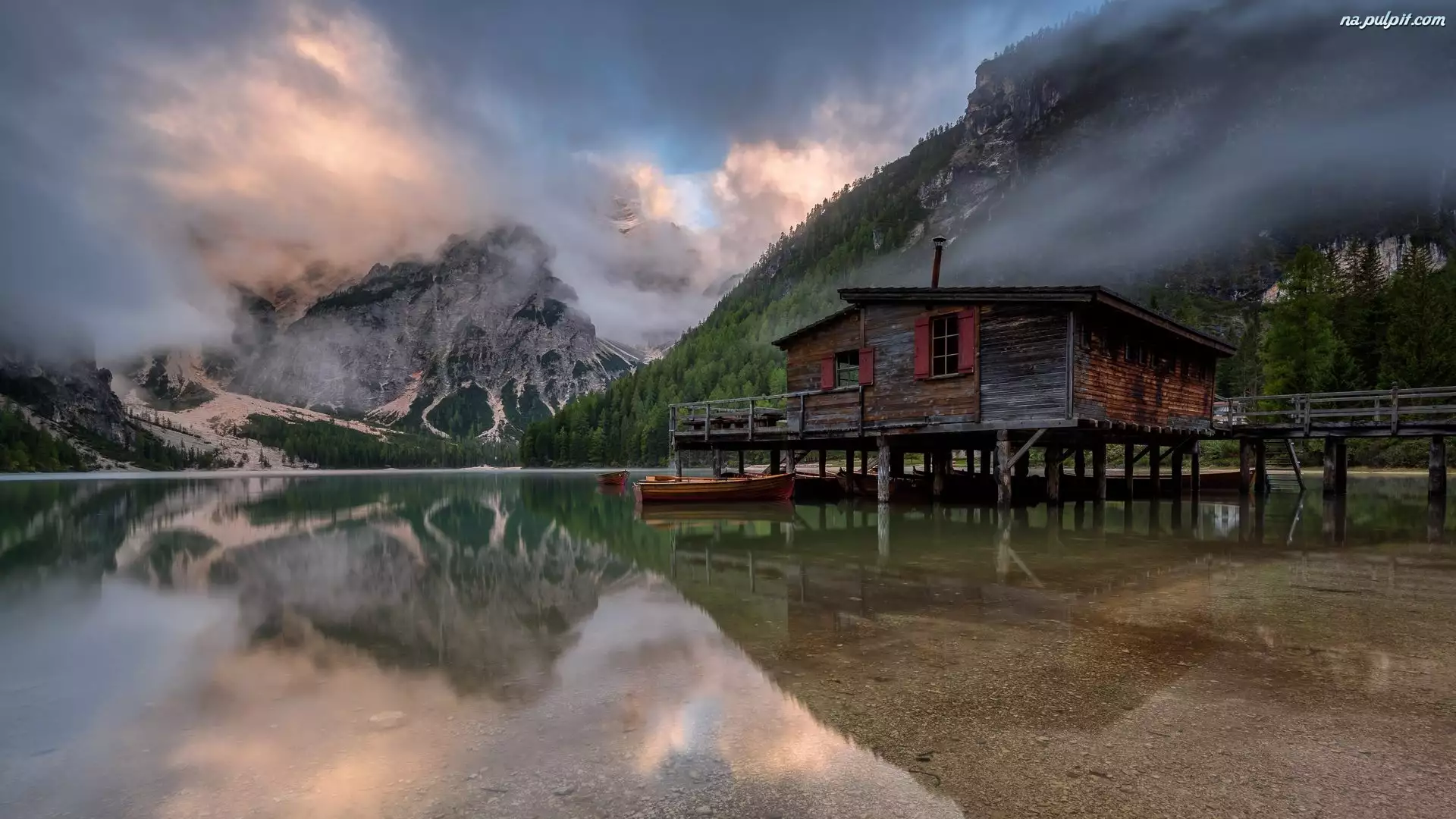 Drewniany, Włochy, Domek, Pomost, Chmury, Góry, Południowy Tyrol, Jezioro, Łódki, Dolomity, Mgła, Lago di Braies, Pragser Wildsee