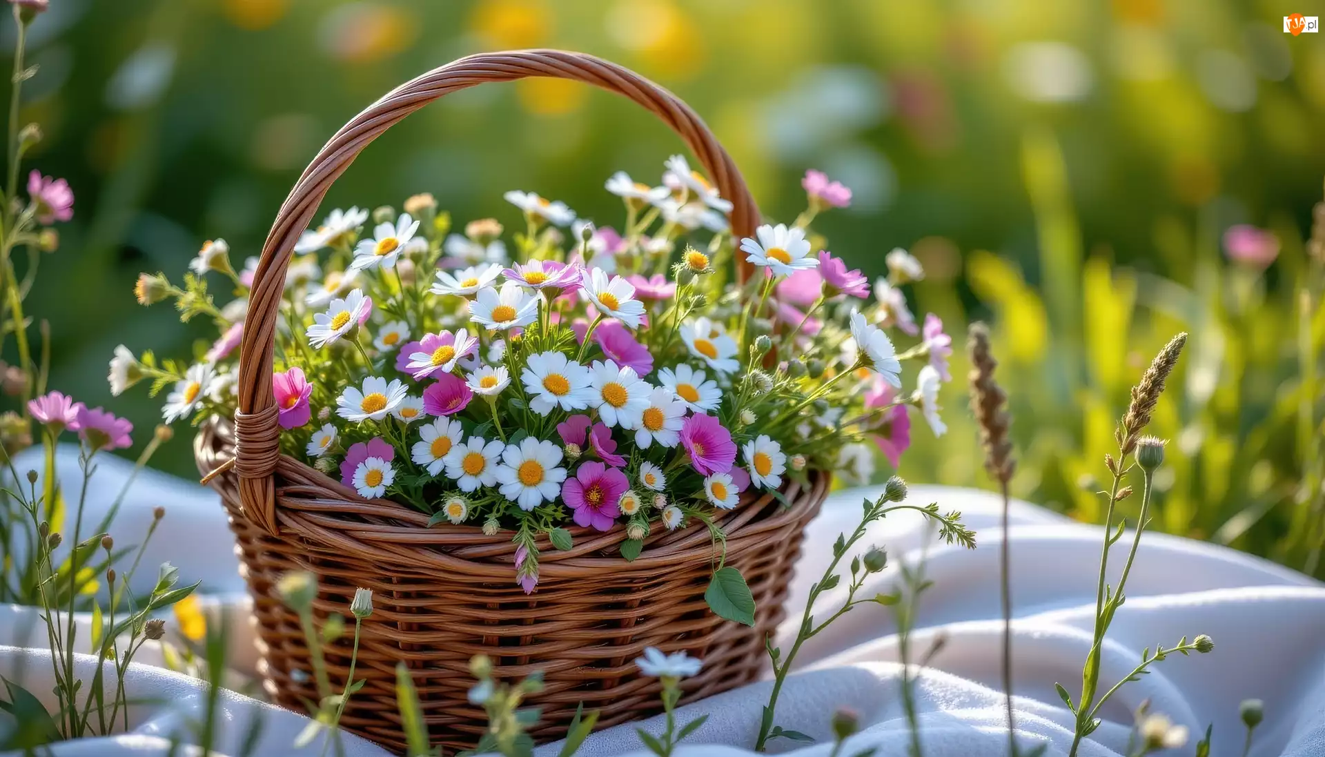 Drobne, Koszyk, Białe, Różowe, Kwiaty
