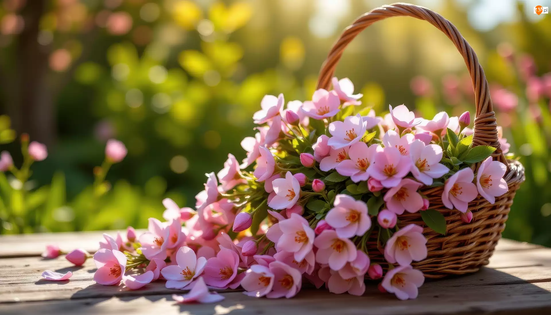 Drobne, Różowe, Wiklinowy, Deski, Kwiaty, Koszyk