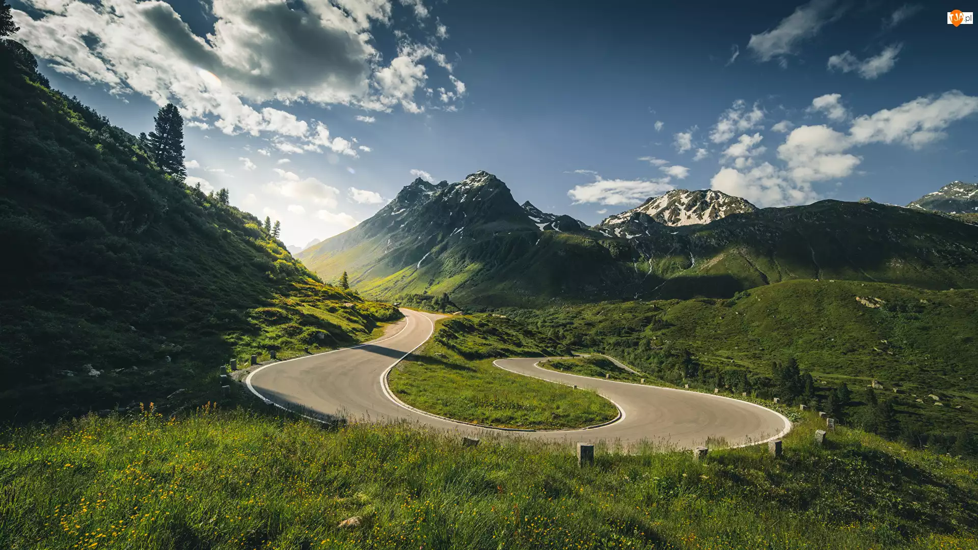 Droga, Góry, Drzewa, Poranek, Zakręt, Trawa