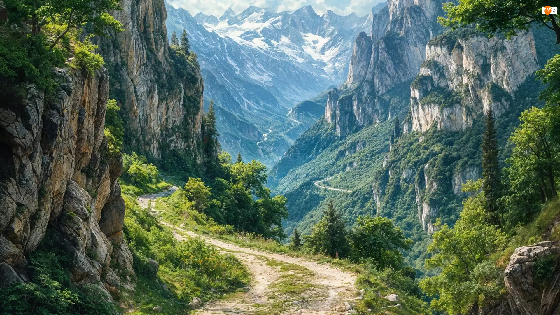 Droga, Kręta, Skały, Grafika, Góry, Drzewa