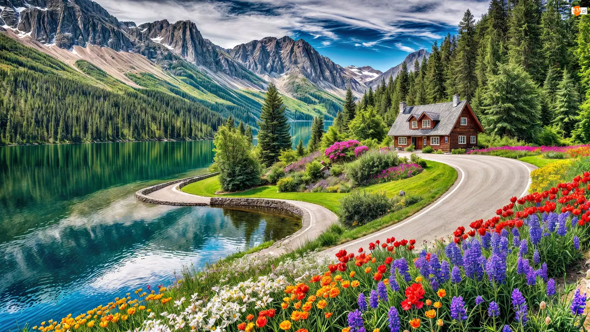 Droga, Kwiaty, Jezioro, Grafika, Dom, Góry