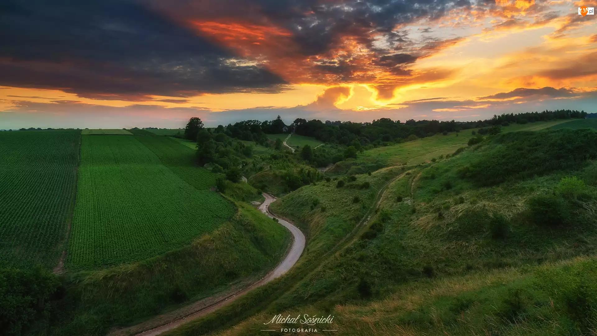 Zielone, Pola, Polska, Droga, Grodzisko Stradów, Ponidzie, Zachód słońca