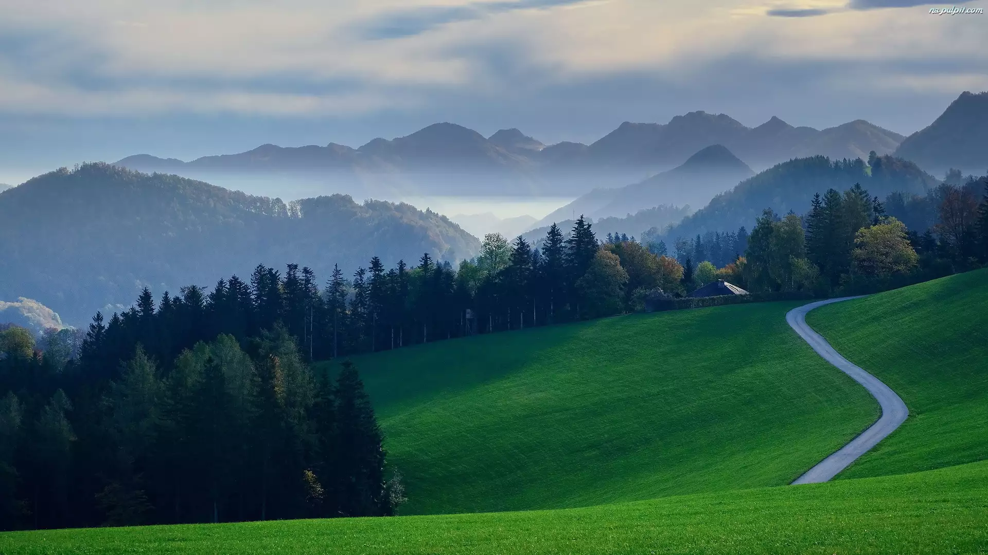 Las, Drzewa, Góry, Droga, Dom, Łąka, Mgła