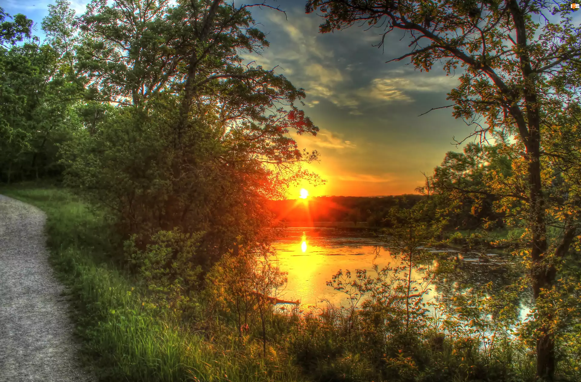 Droga, Rzeka, Drzewa, Zachód słońca, Roślinność
