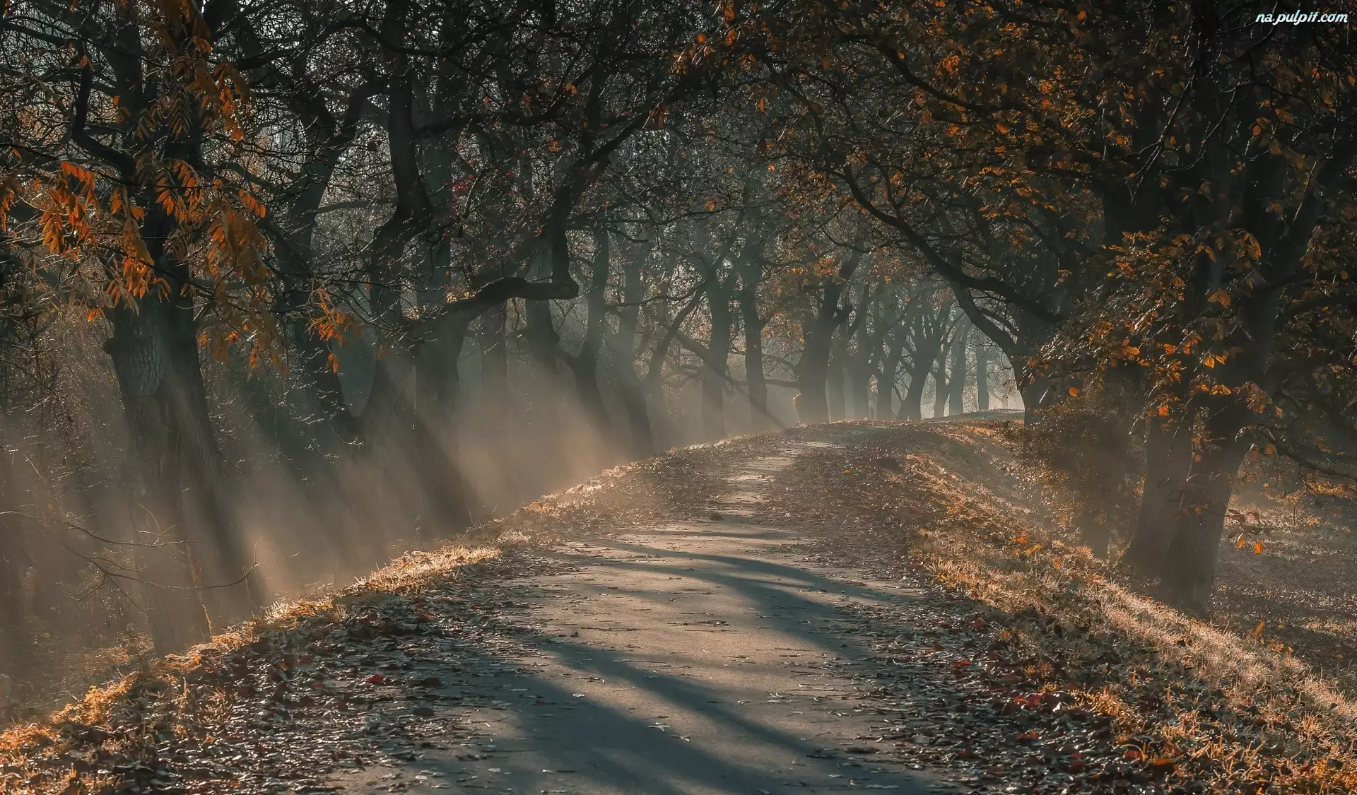 Przebijające Światło, Droga, Mgła, Drzewa, Jesień
