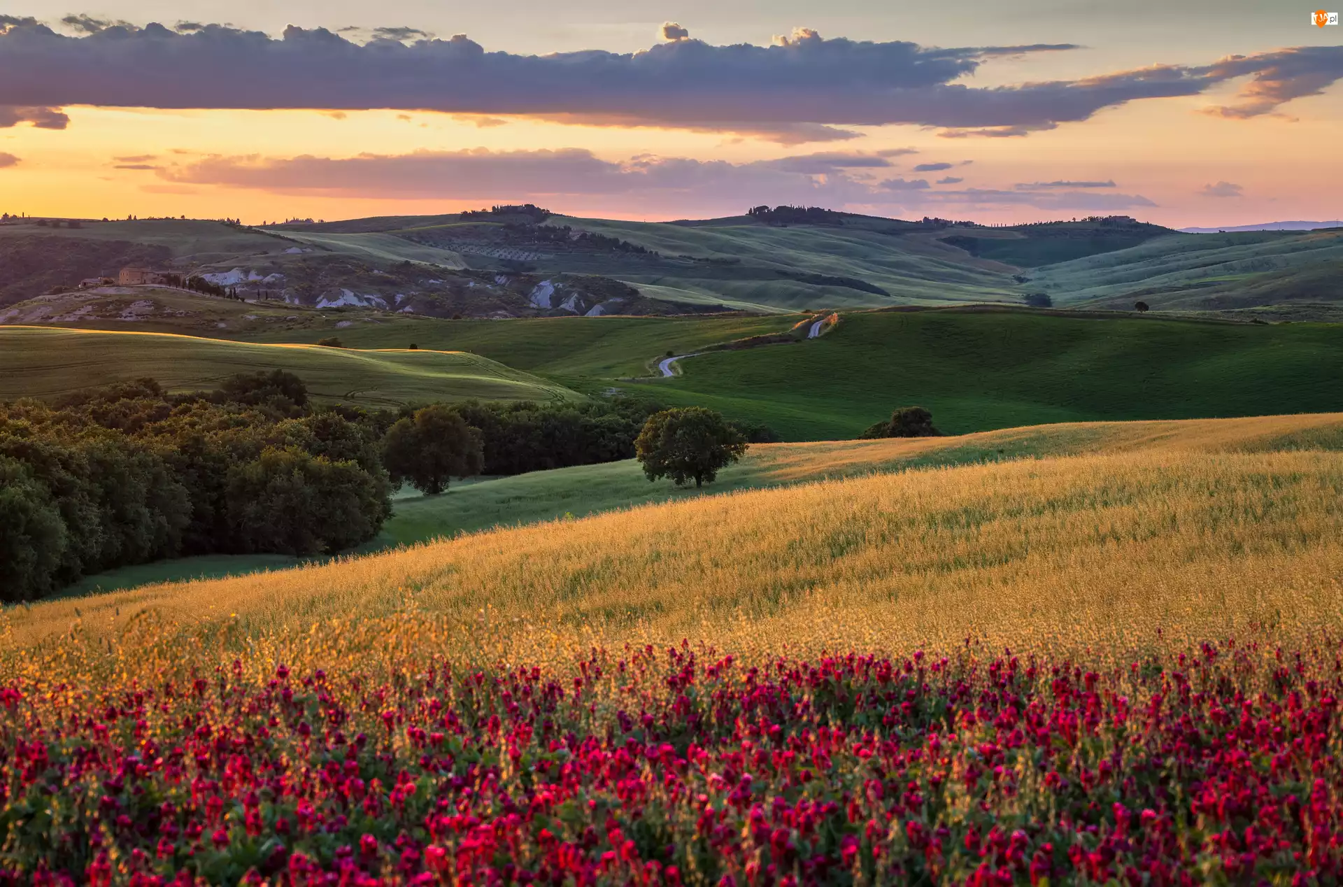 Droga, Wschód słońca, Łąki, Chmury, Wzgórza, Drzewa, Kwiaty, Pola