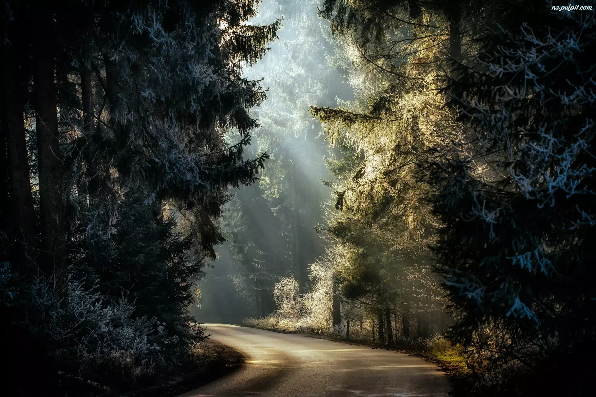 Drzewa, Droga, Przebijające światło, Las, Szron